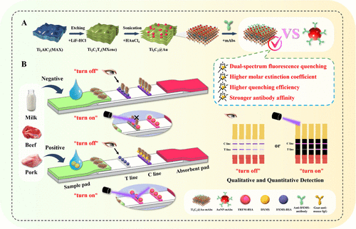本研究首次将MXene材料与LFIA平台相结合用于动物组织中地塞米松的高灵敏检测。首先,采用简单的一锅自还原法制备了Ti3C2@Au,该材料具有高摩尔消光系数、优异的荧光淬灭能力、超高的分散性和良好的生物相容性,使得在低抗体水平下进行有效和灵敏的检测成为可能。该免疫传感器以地塞米松为研究模型,通过“关闭”和“打开”两种模式的结合,实现了信号的相互校准,提高了方法的可靠性,为基于新型MXene材料的生物传感器在食品安全领域中的应用开辟了新视野。
