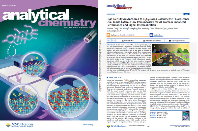 近日,我校食品安全与营养团队在分析化学领域国际权威期刊Analytical Chemistry以Supplementary Cover形式在线发表了题为“High-Density Au Anchored to Ti3C2-Based Colorimetric-Fluorescence Dual-Mode Lateral Flow Immunoassay for All-Domain-Enhanced Performance and Signal Intercalibration”的文章。