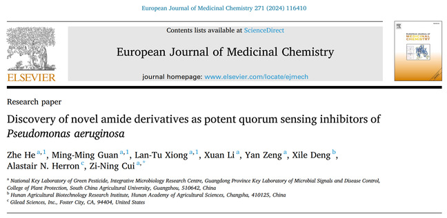 近日,我校群体微生物研究中心、绿色农药全国重点实验室崔紫宁教授课题组在国际药物化学权威期刊European Journal of Medicinal Chemistry(中科院1区Top期刊,影响因子6.7)在线发表了题为“Discovery of novel amide derivatives as potent quorum sensing inhibitors of Pseudomonas aeruginosa”的研究论文。该研究报道了一系列新型酰胺类衍生物通过抑制铜绿假单胞菌群体感应系统,从而有效地降低其致病能力,并阐明了其作用机理和作用靶点。
