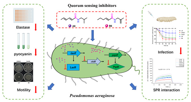在本研究中,该团队设计合成了一系列新型酰胺类衍生物。生物活性评价结果显示,化合物A9和B6显著抑制了铜绿假单胞菌PAO1中lasB、rhlA和pqsA等QS系统中关键基因的表达,并有效减少了PAO1中多种重要毒力因子的产生。此外,化合物A9还能降低PAO1对大蜡螟幼虫的致病能力。同时,通过实时荧光定量PCR、表面等离子共振(SPR)和分子对接等方法进一步研究了这些化合物的作用机理和作用靶点。实验结果显示,化合物A9能够与铜绿假单胞菌QS系统中重要转录调控因子LasR和PqsR结合,尤其是与PqsR结合,从而有效地抑制铜绿假单胞菌的QS系统。该研究结果表明,酰胺类衍生物A9和B6作为铜绿假单胞菌的新型QS系统抑制剂,具备进一步开发的潜力。这项研究成果为控制铜绿假单胞菌的毒力和致病性提供了全新的策略和手段。