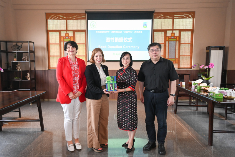 会后,代表团一行参加了我校115周年校庆“开放华农”主题活动图书捐赠仪式。在两校校长见证下,都柏林大学全球关系与合作伙伴关系副总监Eve Brosseau向广东华农大资产经营有限公司赠送了由UCD校友、爱尔兰后现代文学奠基者、作家、诗人詹姆斯•乔伊斯所著的《尤利西斯》等作品。