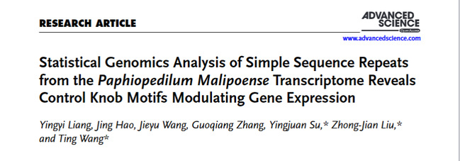 4月22日,Advanced Science(中科院一区Top,影响因子:15.1)发表了我校王艇教授团队、福建农林大学刘仲健教授团队和中山大学苏应娟教授团队合作完成的题为“Statistical genomics analysis of simple sequence repeats from the Paphiopedilum malipoense transcriptome reveals control knob motifs modulating gene expression”的研究论文。