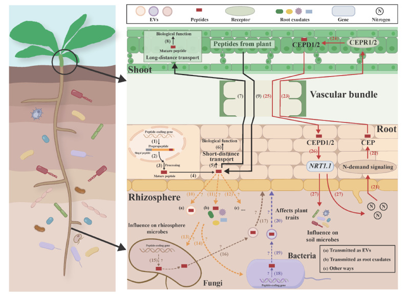 图2.SPPs在植物体内的信号传递过程并影响根际微生物的群落结构。该图还包括小肽(SPPS和SPMs)参与植物-微生物跨界信号交流的可能途径。