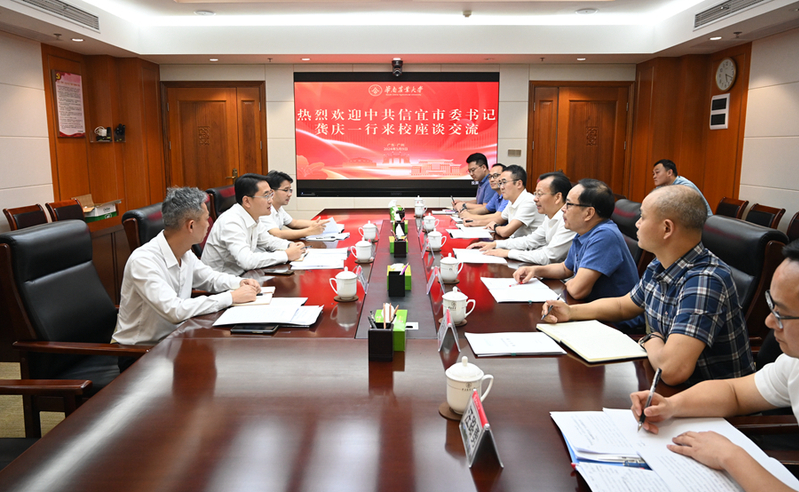 5月9日下午,信宜市委书记龚庆一行来校洽谈农业产业合作事宜,校党委书记李凤亮接待来宾并参加座谈。副校长仇荣亮主持座谈会。