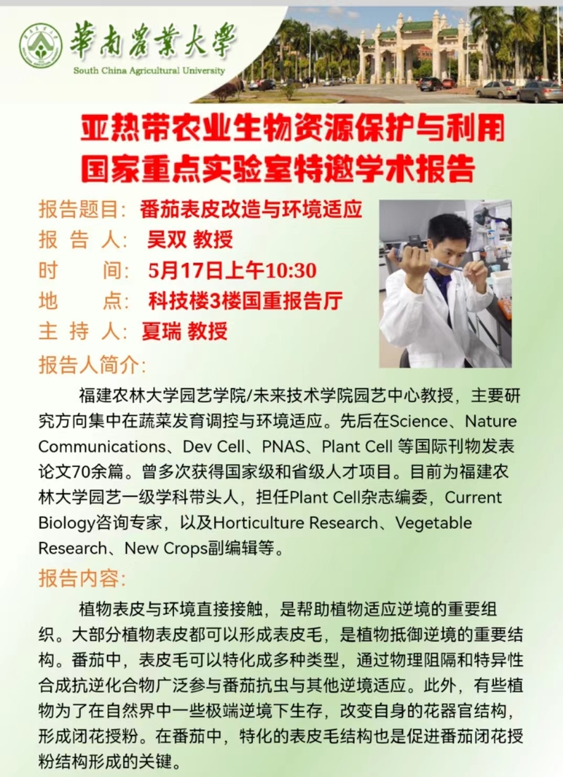 115周年校庆“学术华农”系列活动之0140:亚热带农业生物资源保护与利用国家重点实验室特邀学术报告:番茄表皮改造与环境适应