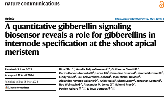 近日,我校农学院作物资源高效研究团队青年教师石碧海副教授与法国国家科学研究中心Teva Vernoux课题组、Patrick Achard课题组合作在国际权威期刊Nature Communications(影响因子16.6,中科院一区Top)发表了题为“A quantitative gibberellin signaling biosensor reveals a role for gibberellins in internode specification at the shoot apical meristem”的研究论文。该研究开发了一种比率型赤霉素(Gibberellins, GA)信号生物传感器(biosensor),首次揭示了GA信号在茎尖分生组织(Shoot apical meristem, SAM)的分布模式,发现了GA信号通过调节细胞分裂面方向调控SAM中节间细胞特化的机制。