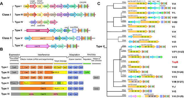 图1.各类CRISPR系统的特点及Type V CRISPR系统的系统发育树