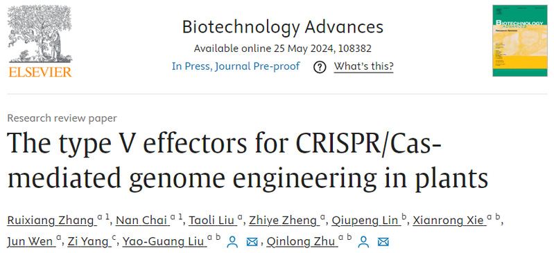 近日,我校亚热带农业生物资源保护与利用国家重点实验室、岭南现代农业科学与技术广东省实验室、生命科学学院和农学院刘耀光院士/祝钦泷研究员团队在生物工程领域国际著名期刊Biotechnology Advances(影响因子16.0,中科院一区,生物工程领域排名4/158)在线发表了题为“The type V effectors for CRISPR/Cas-mediated genome engineering in plants”的研究综述。文中系统总结了V型效应蛋白(CRISPR/Cas12)的结构特征、新效应蛋白的挖掘方法、效应器的工程化改进策略,及其在动物和植物基因编辑中的应用发展,为CRISPR/Cas12在作物遗传改良和提高农业生产等方面的应用,提供了研究思路与有益的参考。