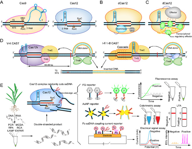除了结构和分类上详细的总结,该综述还重点总结了Type V效应器在植物和动物中的多种应用的现状,包括它们作为碱基编辑器(BE)、调节基因表达的工具、基因打靶(GT)和生物传感器(图4)。
