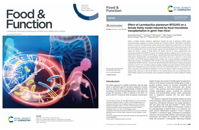 近日,我校食品学院方祥教授团队在食品功能领域国际权威期刊Food & Function(中科院一区Top;影响因子6.5)以封面文章形式在线发表了题为“Effect of Lactobacillus plantarum BFS1243 on a female frailty model induced by fecal microbiota transplantation in germ-free mice”的文章。