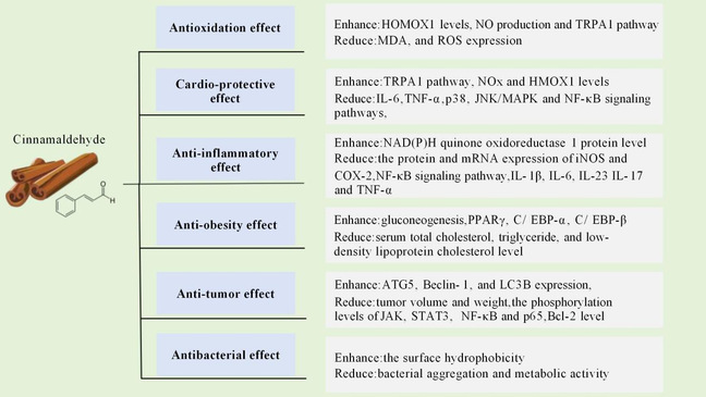 作为最古老的香料之一,肉桂富含镁、铁、钙、纤维、多种维生素和植物化学物质,在世界范围内被广泛应用于食品、香料和医药行业中。目前,肉桂醛被证明具有多种生物活性,如抗氧化、心脏保护、抗炎、抗肥胖、抗肿瘤等,其生物功效及相关分子机制如图1所示。