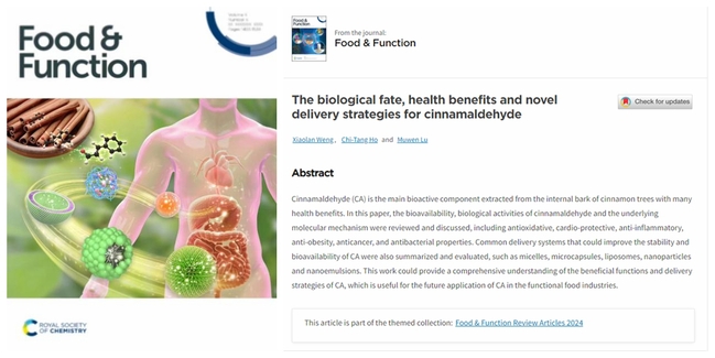 近日,我校食品学院吕慕雯副教授指导学生就肉桂醛的生物活性和口服递送体系在农林科学领域TOP期刊Food & Function(中科院一区Top,影响因子6.1)以封面文章形式在线发表高水平综述性论文“Biological fate, functional properties, and design strategies for oral delivery systems for cinnamaldehyde”。本综述基于近年来的多项研究概述了肉桂醛的健康效应和相关的作用机制,总结了几种以增强肉桂醛稳定性和生物利用度而设计的递送增效体系。该项工作可以为全面了解肉桂醛的有益功效和递送增效策略提供科学依据,为肉桂醛在功能食品行业的进一步应用提供理论指导。
