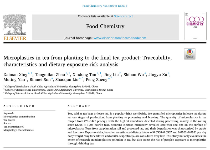茶是世界上广受欢迎的饮品,饮茶有益于健康,亦有益于养生。其通常以茶包或散装茶出售。茶包被接连报道存在微塑料污染,但是散装茶鲜有报道。近日,园艺学院茶学专业2020级本科生邢黛漫以第一作者身份在国际知名期刊Food Chemistry(中科院一区Top,影响因子8.8)发表了题为“Microplastics in tea from planting to the final tea product: Traceability, characteristics and dietary exposure risk analysis”的研究论文。