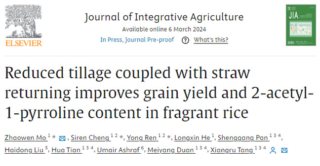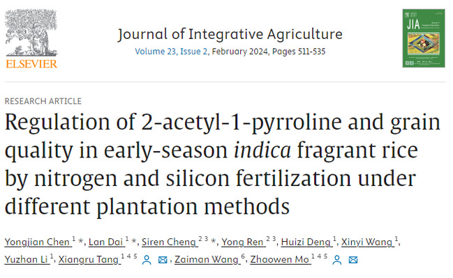 在Journal of Integrative Agriculture上发表2篇论文。题为“Regulation of 2-acetyl-1-pyrroline and grain quality in early-season indica fragrant rice by nitrogen and silicon fertilization under different plantation methods”的论文,研究了在不同氮和硅(N-Si)施肥水平和种植方法下香稻香气物质积累和稻米品质形成的调控,文章第一作者为陈用建硕士毕业生,通讯作者为莫钊文副教授。在线发表题为“Reduced tillage coupled with straw returning improves grain yield and 2-acetyl-1-pyrroline content in fragrant rice”的论文,研究了稻田耕作和秸秆还田条件下香稻产量形成和香气物质积累调控,文章第一作者为莫钊文副教授,通讯作者为唐湘如教授。