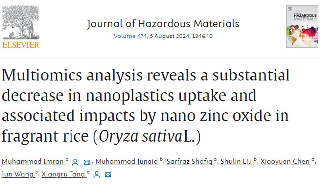 在Journal of Hazardous Materials期刊上发表题为“Multiomics analysis reveals a substantial decrease in nanoplastics uptake and associated impacts by nano zinc oxide in fragrant rice (Oryza sativa L.)”的论文,研究了纳米氧化锌(nZnO)颗粒对减轻80nm纳米塑料(NPs)对香米不利影响的作用。结果表明,nZnO的补充有效阻碍了NPs的吸收,提供了一种可持续的策略以提高NPs毒性下的作物产量。文章第一作者为博士后Muhammad Imran,通讯作者为唐湘如教授。