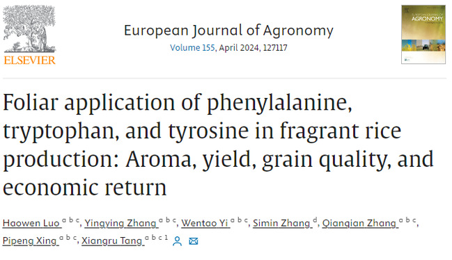 在European Journal of Agronomy上发表题为“Foliar application of phenylalanine, tryptophan, and tyrosine in fragrant rice production: Aroma, yield, grain quality, and economic return”的论文,研究了外源氨基酸对香米香气、产量、粮食品质和经济收益的影响。结果显示,苯丙氨酸、色氨酸和酪氨酸的叶面喷施提高了香米产量和经济收益,并增强了2-AP的生物合成。文章第一作者为罗昊文博士,通讯作者为唐湘如教授。