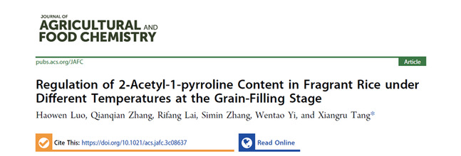 在Journal of Agricultural and Food Chemistry上发表的论文题为“Regulation of 2-acetyl-1-pyrroline content in fragrant rice under different temperatures at the grain-filling stage”,探讨了不同温度对香米2-乙酰-1-吡咯啉(2-AP)生物合成的影响及其调控机制。研究结果显示,低温条件下2-AP、脯氨酸和γ-氨基丁酸的含量显著增加,高温则相反。文章第一作者为罗昊文博士,通讯作者为唐湘如教授。