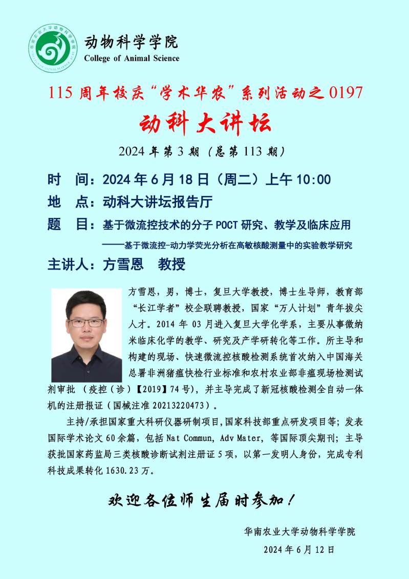 115周年校庆“学术华农”系列活动之0197:动科大讲坛:基于微流控技术的分子POCT研究、教学及临床应用——基于微流控-动力学荧光分析在高敏核酸测量中的实验教学研究