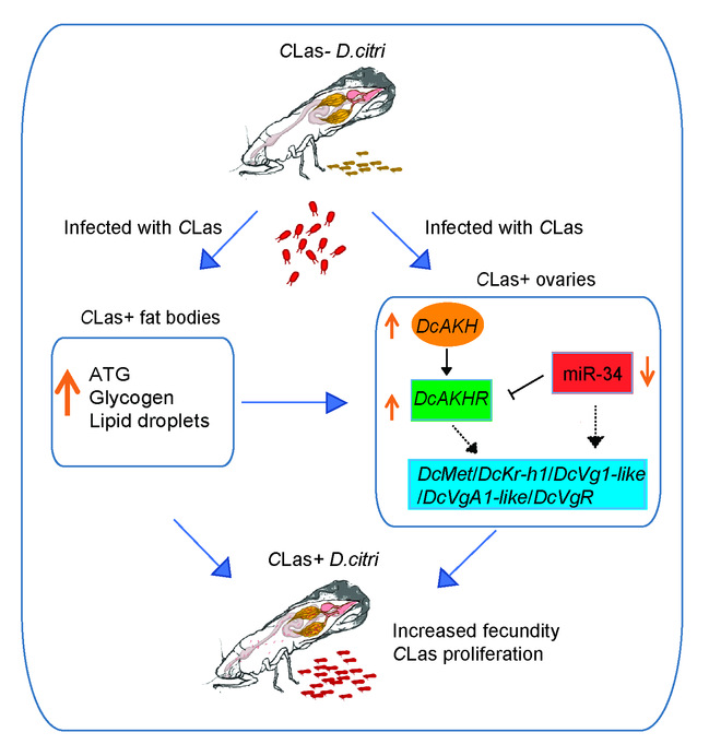 昆虫的生殖过程高耗能,而脂动激素(Adipokinetic hormone,AKH)信号通路调控着能量储存与释放的动态平衡。黄龙病菌侵染导致柑橘木虱生殖力提高,这必然需要更多的能量供应。该研究首先通过ELISA试剂盒检测和脂滴染色等实验,初步明确了黄龙病菌侵染会导致柑橘木虱脂肪体内甘油三酯TAG含量和糖元含量明显升高;随后利用qRT-PCR、免疫荧光、Western blot和RNAi等技术,发现带菌柑橘木虱卵巢内脂动激素DcAKH及其受体DcAKHR表达量显著提高;降低DcAKH/DcAKHR的表达后,带菌木虱脂肪体内TAG含量、糖元和脂滴大小异常,产卵量和卵巢内黄龙病菌的滴度也显著降低,说明DcAKH/DcAKHR在带菌木虱生殖力提高和能量代谢增加方面发挥着重要作用。进一步通过双荧光素酶检测、qRT-PCR、FISH和RNA结合蛋白免疫沉淀(RIP)等研究证明,miR-34通过负调控靶标基因DcAKHR的表达参与黄龙病菌提高柑橘木虱生殖力的过程。同时,DcAKHR和miR-34作用于保幼激素信号通路JH-Met-Kr-h1的上游。这项研究不仅在理论上拓宽了对媒介昆虫-病原体互作关系的理解,也从实践上为柑橘木虱和柑橘黄龙病的有效防控提供了新靶标和新思路。