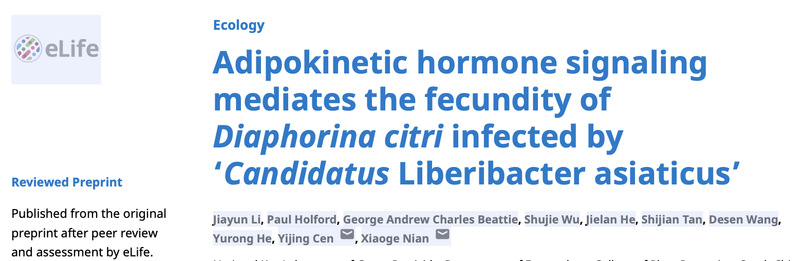近日,植物保护学院何余容、岑伊静团队在国际著名期刊eLife(中科院1区,影响因子8.3)在线发表了题为“Adipokinetic hormone signaling mediates the enhanced fecundity of Diaphorina citri infected by 'Candidatus Liberibacter asiaticus'”的论文。该研究首次阐明了柑橘黄龙病菌通过调控宿主柑橘木虱的能量代谢进而显著提高其生殖力的分子机制。这一成果是继该团队于2023年在Molecular Ecology上发表“黄龙病菌通过提高柑橘木虱生殖力从而有利于自身的传播~双赢策略”论文的基础上,在柑橘木虱-黄龙病菌互作研究领域取得的又一重要发现,为理解病原体与媒介昆虫相互作用提供了新的视角。