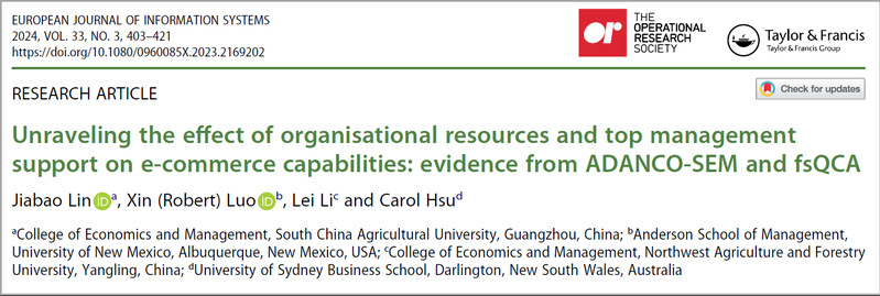 近日,经济管理学院林家宝教授团队的论文“Unraveling the effect of organizational resources and top management support on e-commerce capabilities: Evidence from ADANCO-SEM and fsQCA”刊发在国际权威期刊European Journal of Information Systems (SSCI和SCI双收录,JCR一区,影响因子9.5)。