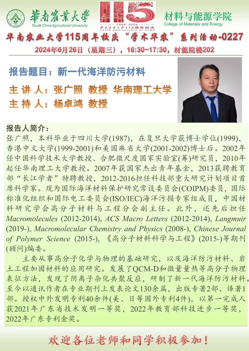 115周年校庆“学术华农”系列活动之0227: 材能学院学术报告:新一代海洋防污材料