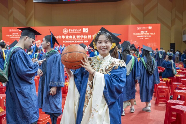 作为农学院的硕士研究生和华农男篮主力队员,陈艺源参加了今天的典礼暖场环节。硕士三年,他助力华农男篮蝉联全国大学生篮球二级联赛全国总冠军,还拿过一次MVP(最有价值球员)称号。学业爱好两不误的他,在备战今年的男篮全国赛时,还成功拿到了华农作物育种专业博士的录取通知。“希望自己能继续科研道路,然后争取留校,为华农贡献更多力量。” 陈艺源表示。