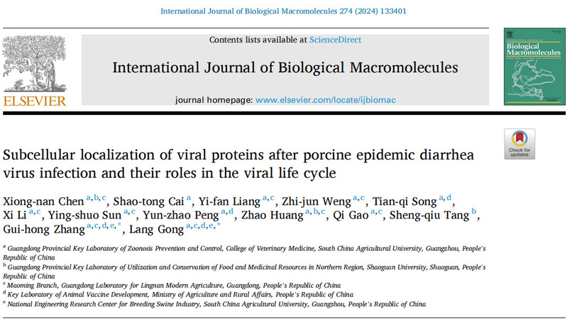 近日,我校兽医学院张桂红/龚浪课题组以华农兽医学院为第一单位,在中科院一区生化与分子生物学权威杂志International Journal Of Biological Macromolecules在线发表题为“Subcellular localization of viral proteins after porcine epidemic diarrhea virus infection and their roles in the viral life cycle”的文章。本研究主要利用内源性宿主蛋白抗体分析PEDV蛋白的亚细胞定位,以研究它们在病毒生命周期中的作用,包括内吞作用、细胞内运输、基因组复制、能量代谢、出芽和释放。研究还发现宿主内吞分选转运复合体 (ESCRT) 与PEDV的复制和出芽过程密切相关。