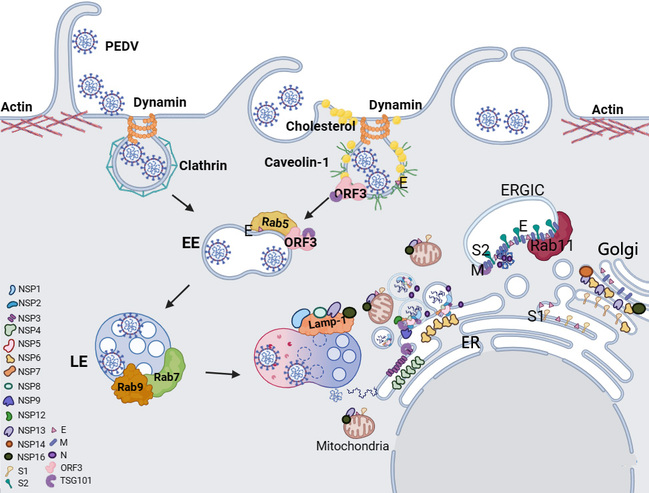 PEDV反复暴发给全球养猪业造成了巨大的经济损失。目前没有高效广谱疫苗。解析其致病机制可为开发疫苗提供新的思路。本研究在病毒感染状态下,分析了PEDV生命周期各个阶段中不同病毒蛋白所发挥的生物学功能,发现病毒与宿主之间存在几种先前未被报道的相互作用。在本研究中,克隆了除NSP11外的所有PEDV病毒蛋白,并在病毒内吞、细胞内运输、病毒基因组复制、病毒出芽和释放过程中观察病毒蛋白与细胞器标志蛋白的定位现象,例如在研究中发现NSP1、NSP3、NSP9、NSP12、NSP13、ORF3和M蛋白与宿主蛋白TSG101共定位。其中,NSP12作为病毒RNA聚合酶参与PEDV复制,NSP1、NSP3、NSP9和NSP13与病毒dsRNA共定位。因此,我们推测PEDV复制相关蛋白通过与宿主TSG101相互作用参与病毒复制。通过共聚焦显微镜发现在感染过程中病毒N蛋白和dsRNA与TSG101共定位,通过免疫电镜观察到PEDV诱导的双膜囊泡 (DMVs) 与TSG101共定位。此外,我们之前的研究发现PEDV M蛋白与TSG101存在相互作用,推测可能与病毒出芽有关。本研究通过免疫电镜也观察到含PEDV颗粒的巨型囊泡 (LVCVs) 与TSG101共定位,而LVCV被广泛报道作为冠状病毒出芽的亚细胞结构,提示TSG101可能对于病毒复制和出芽至关重要。最后,对研究中所有病毒蛋白定位结果汇总如下图所示,该研究结果有助于更好地理解PEDV感染的致病机制。