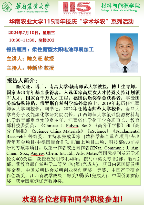 115周年校庆“学术华农”系列活动之0247: 材能学院学术报告:柔性新型太阳电池印刷加工