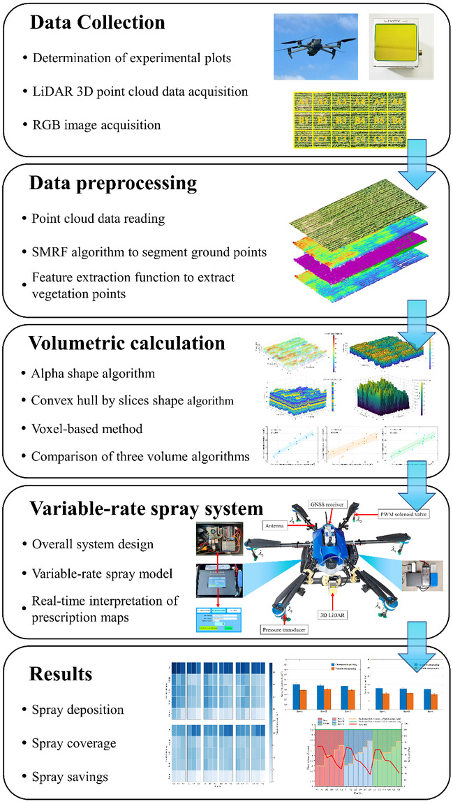 本研究利用无人机搭载激光雷达传感器,开发了一种根据作物冠层形态的自适应流量控制的无人机变量喷雾系统。基于SRMF算法和特征提取函数来处理激光雷达传感器所获取的点云数据,通过alpha形状算法来计算棉花冠层体积,构建了无人机飞行参数、棉花冠层体积、喷施参数等与变量控制信号占空比的关系模型,这允许无人机实时调整流量以匹配棉花冠层结构,以支持棉花的精确喷洒。实验结果表明,本文所设计的无人机变量喷雾系统与传统定量喷雾相比,变量喷雾系统以较低的喷施速率提供了与定量喷雾近似的生物功效。同时确保良好的应用质量,从而提供了节省农药和降低劳动成本的机会。