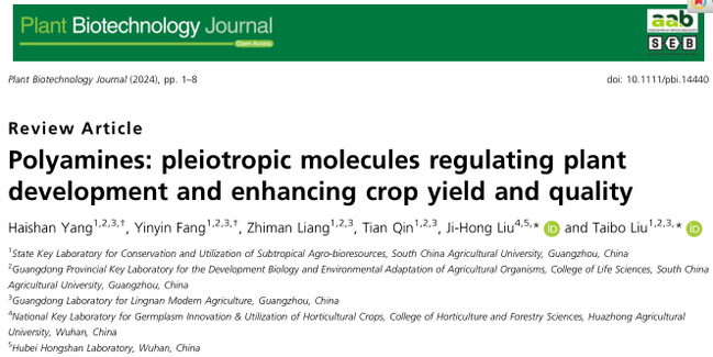 近日,我校生命科学学院、亚热带农业生物资源保护与利用国家重点实验室陶利珍/刘太波课题组,联合华中农业大学园艺林学学院、果蔬园艺作物种质创新与利用全国重点实验室刘继红课题组,在中科院一区TOP期刊Plant Biotechnology Journal(五年影响因子:11.6)上发表题为“Polyamines: pleiotropic molecules regulating plant development and enhancing crop yield and quality”的综述文章。