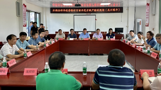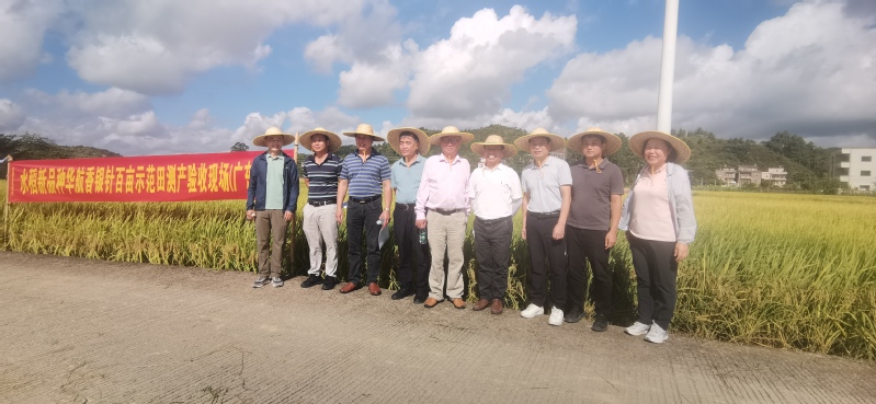 由华南农业大学国家植物航天育种工程技术研究中心育成的水稻新品种——“华航香银针”,在田心镇塔丰村进行百亩示范方实割测产验收。受农业农村部委托,广东省农业农村厅组织了由广西壮族自治区农业技术推广总站、中国水稻研究所等单位的省内外水稻育种、栽培、农业技术推广、植物保护、土壤肥料等领域7名专家组成验收专家小组,现场考察了该品种的田间种植表现。