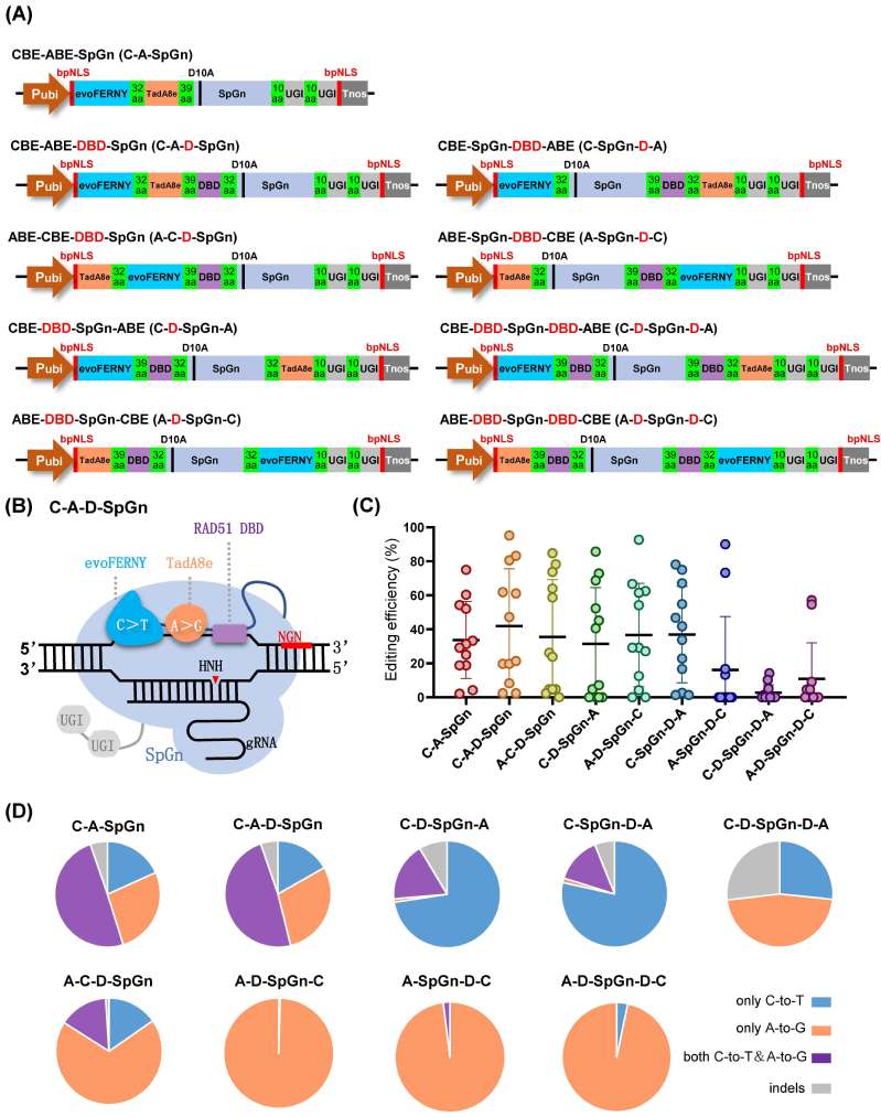 图1.双碱基编辑器DBE-SpGn的结构与编辑特征。(A)DBE-SpGn的载体结构图;(B)C-A-D-SpGn的工作示意图;(C)DBE-SpGn分别在12个测试的水稻内源靶点的编辑效率;(D)各个载体在靶点范围内所产生的不同的碱基编辑产物。