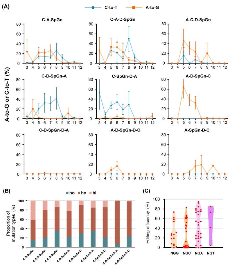 从DBE-SpGn载体中筛选出能够高效产生A-to-G&C-to-T同步替换的一组双碱基编辑器(C-A-SpGn,C-A-D-SpGn和A-C-D-SpGn),将其命名为PhieDBEs。其中C-A-D-SpGn在靶点V2TS6-TGW6上编辑效率最高可达95.2%,并且A-to-G&C-to-T同时替换的概率最高达81.0%。此外,PhieDBEs的C-to-T和A-to-G编辑窗口趋于一致,主要口集中在M5-M9(M=A/C),C-A-SpGn和C-A-D-SpGn在主要窗口外的A3处也显示较高的编辑活性(图2)。与此前大部分研究报道的碱基编辑器相较而言,PhieDBEs编辑窗口变窄,更有利于进行精准编辑。最后,该研究对PhieDBEs的多种编辑特性进行了分析,结果表明能够高效靶向NG PAM,并且在靶点内对A或C的编辑都不存在明显的序列背景偏好性,使用一个载体能够实现多个靶点同时产生多种类型的碱基替换等优点。