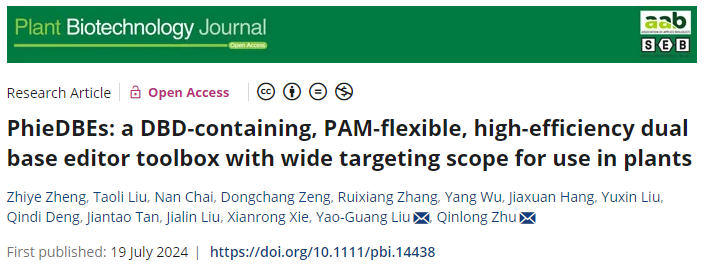 近日,我校农学院、亚热带农业生物资源保护与利用国家重点实验室、岭南现代农业科学与技术广东省实验室刘耀光院士/祝钦泷研究员团队在国际著名学术期刊Plant Biotechnology Journal(影响因子11.6, 生物/工程技术1区)在线发表了题为“PhieDBEs: a DBD-containing, PAM-flexible, high-efficiency dual base editor toolbox with wide targeting scope for use in plants”的研究论文。