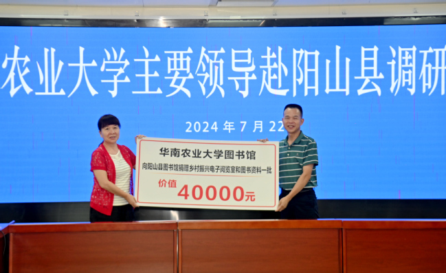 会上举行了捐赠仪式,我校图书馆向阳山县图书馆捐赠了价值4万元的乡村振兴电子阅览室和图书资料一批。