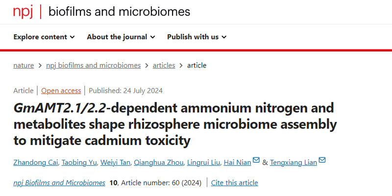 近日,我校农学院年海教授团队在国际著名植物学期刊npj Biofilms and Microbiomes(中科院1区Top,影响因子7.8)在线发表了题为“GmAMT2.1/2.2-dependent ammonium nitrogen and metabolites shape rhizosphere microbiome assembly to mitigate cadmium toxicity”的研究论文。