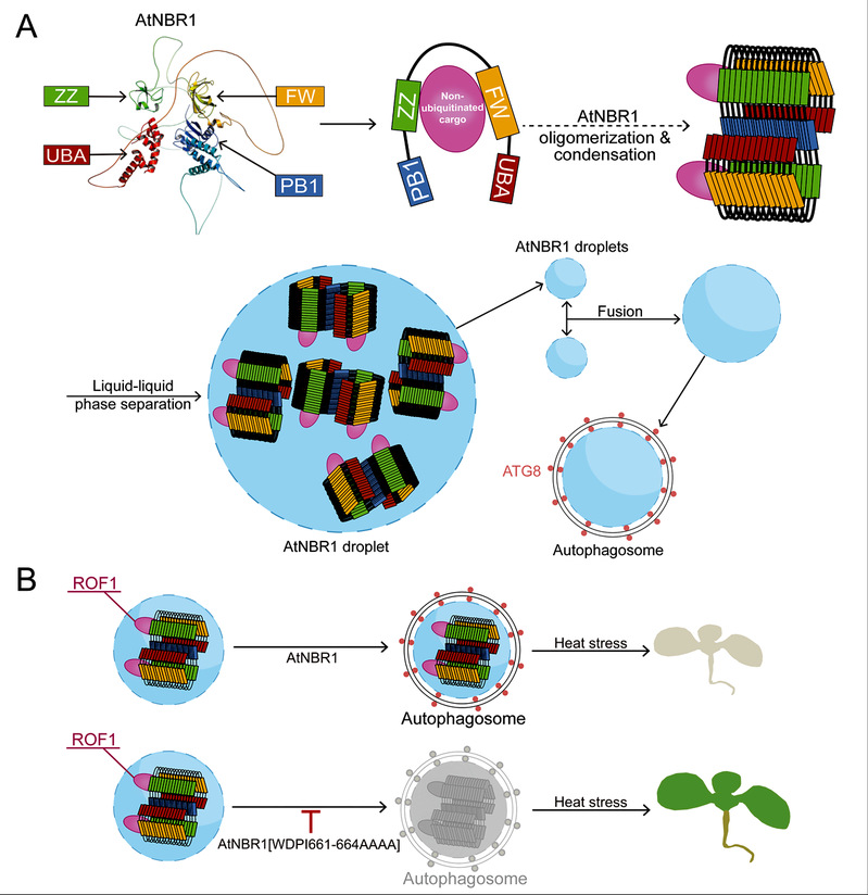 研究人员通过对植物NBR1的结构域进行了分析,并且与后生动物p62和NBR1进行了分析与比较,构建了不同功能结构域的突变,以研究AtNBR1与已知的非泛素化货物ROF1和Exo70E2的相互作用模式。通过荧光共定位、酵母双杂交、双荧光素酶标记和免疫共沉淀实验表明AtNBR1降解非泛素化底物需要ZZ和FW结构域的共同参与。 此外,研究还发现,AtNBR1在ATG8介导的自噬体形成之前发生液-液相分离,且这一过程对拟南芥的高温胁迫耐受能力至关重要。该研究首次发现了拟南芥NBR1的相分离能力和发生过程,揭示了其与非泛素化底物相互作用模式和在植物自噬中的双重功能,即自噬底物识别和液-液相分离,进一步深化了我们对植物中NBR1介导自噬机制的理解,相较于动物的研究提供了全新的视角。该研究不仅为植物自噬机制提供了新知识,也为进一步研究植物自噬在高温胁迫中的调控机制和生物学功能奠定了基础。