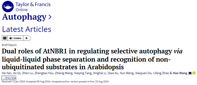 8月21日,华南农业大学生命科学学院王浩教授团队在 Autophagy(影响因子14.6) 上发表题为“Dual roles of AtNBR1 in regulating selective autophagy via liquid-liquid phase separation and recognition of non-ubiquitinated substrates in Arabidopsis”的研究论文,该研究揭示了植物中的NBR1在选择性自噬中的双重作用和在进化过程中其在植物与动物中的区别与联系。
