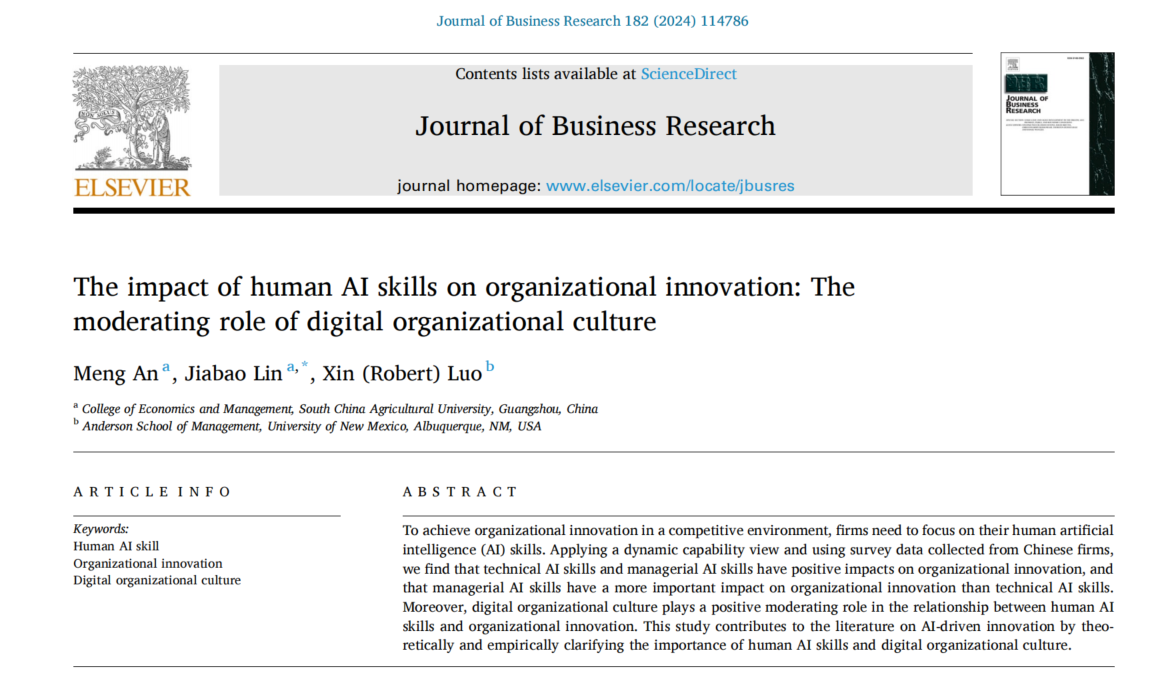 近日,经济管理学院林家宝教授课题组在国际知名期刊Journal of Business Research(SSCI,中科院一区Top,影响因子11.3)发表了题为The impact of human AI skills on organizational innovation: The moderating role of digital organizational culture的研究论文。Journal of Business Research创刊于1973年,是商学领域高水平学术期刊、英国商学院协会认定的ABS3星期刊、ESI经济与商学来源期刊,专注于将商业理论运用于企业管理实践。