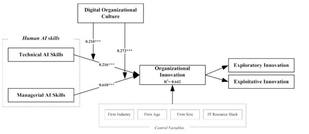 为了在竞争环境中实现组织创新,企业需要专注于员工AI技能。本文基于动态能力视角构建了员工AI技能对组织创新的影响模型,旨在揭示员工AI技能对组织创新的潜在影响以及数字组织文化的调节作用。基于匹配样本的调查数据,实证结果发现员工的技术AI技能和管理AI技能对组织创新都有积极影响,但员工的管理AI技能对组织创新的影响比员工的技术AI技能更重要,数字化组织文化在员工AI技能与组织创新之间的关系中起着正向调节作用,如图1所示。