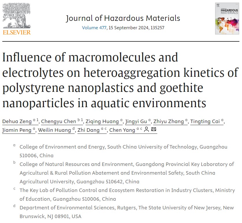 课题组在国际著名刊物Journal of Hazardous Materials(2024, 477, 135257)上发表题为“Influence of macromolecules and electrolytes on heteroaggregation kinetics of polystyrene nanoplastics and goethite nanoparticles in aquatic environments”的研究论文。该论文联合华南理工大学环境与能源学院杨琛教授共同完成,陈澄宇副教授为共同第一作者。该研究对比了蛋白质、DNA与腐殖质等环境与生物大分子对水中纳米塑料及针铁矿纳米颗粒间的作用过程影响机制,并构建了预测模型。