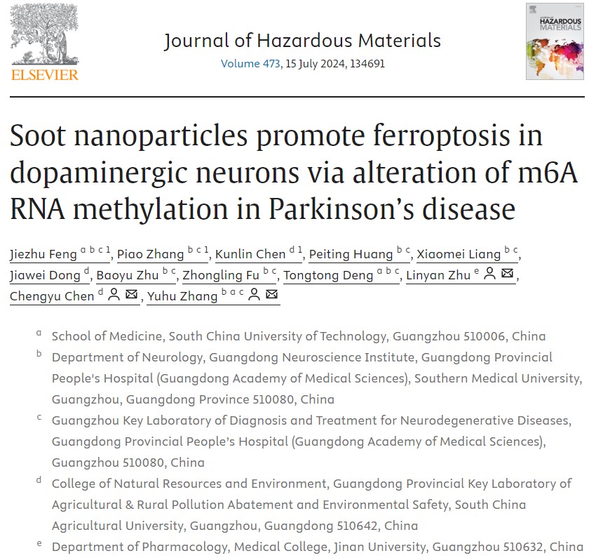 课题组在国际著名刊物Journal of Hazardous Materials(2024, 473, 134691)上发表题为“Soot nanoparticles promote ferroptosis in dopaminergic neurons via alteration of m6A RNA methylation in Parkinson’s disease”的研究论文。该论文联合广东省人民医院、暨南大学共同完成,华南理工大学/广东省人民医院博士研究生封洁珠、广东省人民医院神经科张飘、资源环境学院硕士生陈坤霖为本文的共同第一作者;广东省人民医院神经科张玉虎主任、资源环境学院陈澄宇副教授、暨南大学医学院朱林燕教授为共同通讯作者。该研究揭示了烟尘纳米颗粒通过增加甲基化转移酶METTL3,扩增ACSL4蛋白表达,加速多巴胺能神经元的铁死亡进程,从而加剧帕金森病的发生和发展。