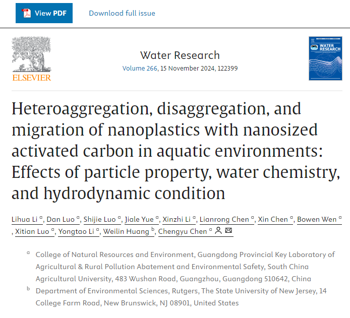课题组在国际著名刊物Water Research(2024, 266, 122399)上发表题为“Heteroaggregation, disaggregation, and migration of nanoplastics with nanosized activated carbon in aquatic environments: Effects of particle property, water chemistry, and hydrodynamic condition”的研究论文。资源环境学院硕士生李丽华为论文第一作者,陈澄宇副教授为通讯作者。该研究针对纳米活性炭这类新型碳纳米材料,通过模拟异聚、解聚、波浪、湍流与沉降等水动力条件,定量解析了其与新污染物纳米塑料在水环境中的颗粒间微观作用过程,为两者的环境迁移提供新见解。