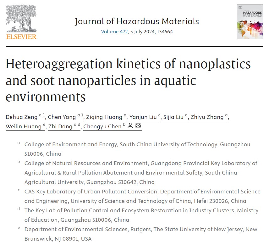 课题组在国际著名刊物Journal of Hazardous Materials(2024, 472, 134564)上发表题为“Heteroaggregation kinetics of nanoplastics and soot nanoparticles in aquatic environments”的研究论文。该论文联合华南理工大学环境与能源学院杨琛教授共同完成,陈澄宇副教授为通讯作者。研究针对柴油机尾气排放的黑碳纳米颗粒与纳米塑料在腐殖酸作用下的异型凝聚过程,定量了颗粒间作用力对胶体稳定性的贡献。