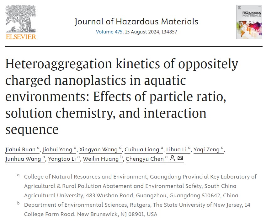 课题组在国际著名刊物Journal of Hazardous Materials(2024, 475, 134857)上发表题为“Heteroaggregation kinetics of oppositely charged nanoplastics in aquatic environments: Effects of particle ratio, solution chemistry, and interaction sequence”的研究论文。资环学院硕士生阮嘉惠为论文第一作者,陈澄宇副教授为通讯作者。该研究针对水环境中持有正电荷与负电荷的纳米塑料颗粒,明确了颗粒性质、水化学条件、作用顺序对颗粒异聚动力学的影响机制。