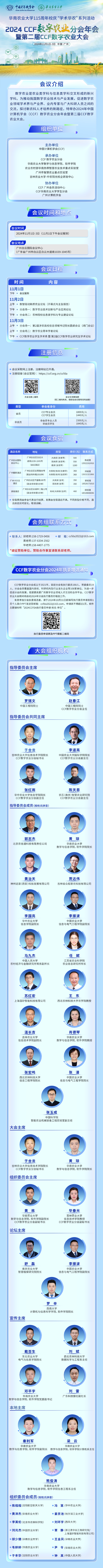 2024年11月1日至3日,我校数学与信息学院、软件学院承办的115周年校庆“学术华农”系列活动暨第二届中国计算机学会(CCF)数字农业大会将在广州白云国际会议中心举行。