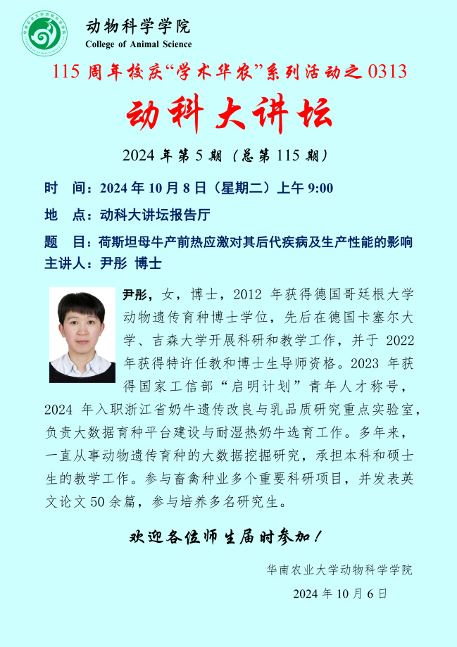115周年校庆“学术华农”系列活动之 0313:动科大讲坛:荷斯坦母牛产前热应激对其后代疾病及生产性能的影响