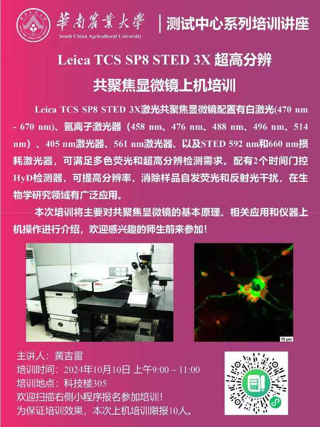 115周年校庆“学术华农”系列活动之0318:测试中心系列培训讲座:Leica TCS SP8 STED 3X超高分辨共聚焦显微镜上机培训